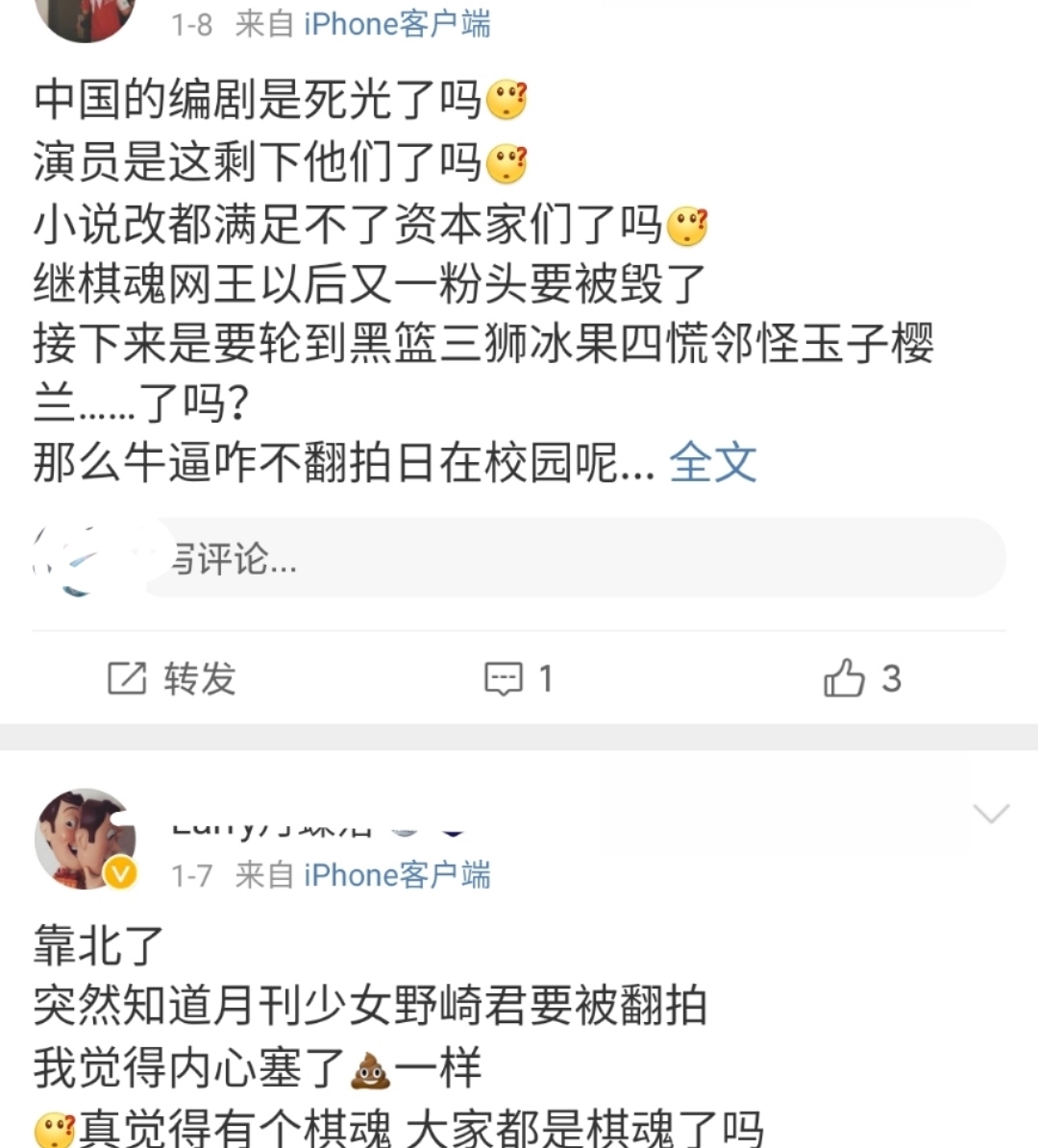 此外,剧中的人物大多是夸张的二次元的表现手法都可以实现,但是三次元中夸张的颜一实在是太难模仿了,也很难一一还原。不少网友表示不希望这部剧被改编,同时也抱怨国内编剧的能力。