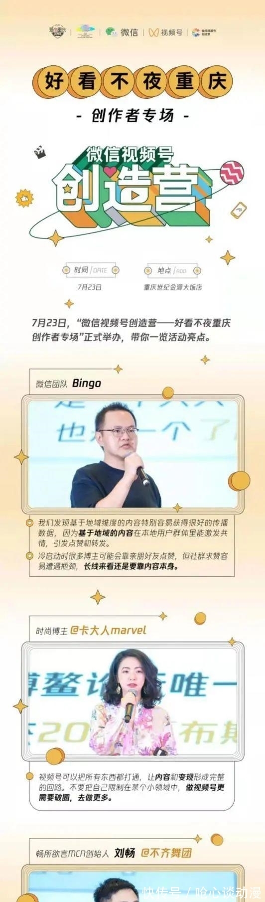 7月23日,“微信视频账号创建营——重庆创客专场”正式启动。近300名视频账号创建者和商旅文体产业代表齐聚山城,共商视频共创新机遇,分享最美山城夜景。